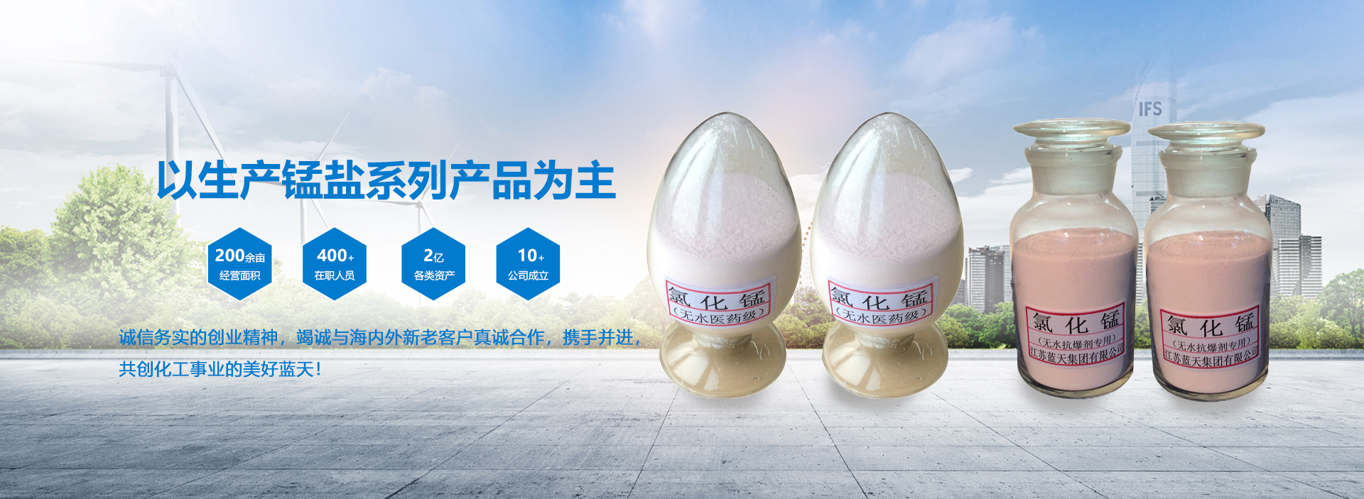 淮安市藍天化工有限公司,是以生產(chǎn)錳鹽等無機鹽系列產(chǎn)品為主。農(nóng)藥中間體、醫(yī)藥中間體加工、新產(chǎn)品研發(fā)為一體的大型綜合性民營企業(yè)。公司業(yè)務(wù)遍及海內(nèi)外數(shù)十個城市與地區(qū),現(xiàn)擁有各類資產(chǎn)2億多元,生產(chǎn)經(jīng)營面積200余畝,員工400多人。其中各類專業(yè)技術(shù)人員占1/3以上。并具有較強的技術(shù)研發(fā)和生產(chǎn)能力。現(xiàn)已初步形成一支高素質(zhì)、敬業(yè)愛崗、廉潔高效的作戰(zhàn)團隊。